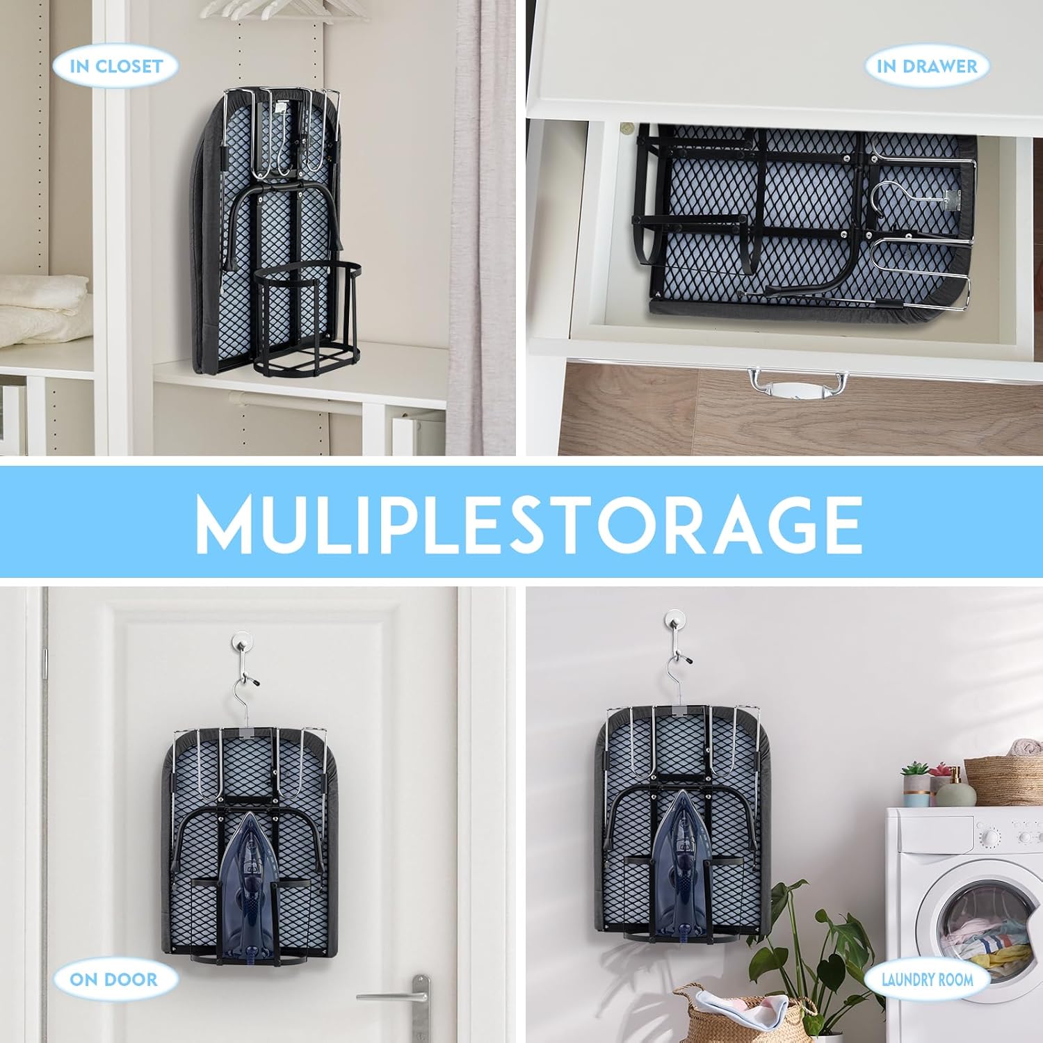 - ALL IN ONE STORAGE STABILITY- Iron and ironing board set never lose your iron again! When using a small ironing board, pulling out the iron holder can place the iron. Even if the iron is still warm after ironing, it can be placed directly in the storage basket. No more worries about storing irons
