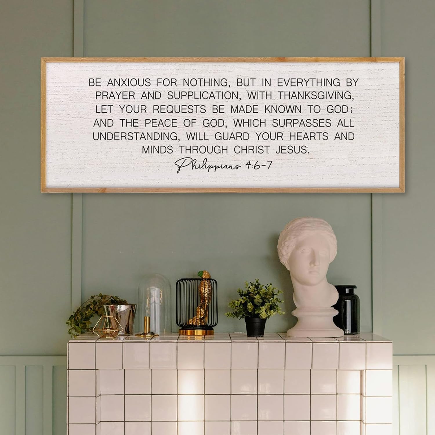 LuZhiQiang Be Anxious for Nothing Wall Decor 32"×12" Philippians 4:6-7 Bible Verse Sign Large Christian Scripture Wood Framed Hanging Decor (Wood)