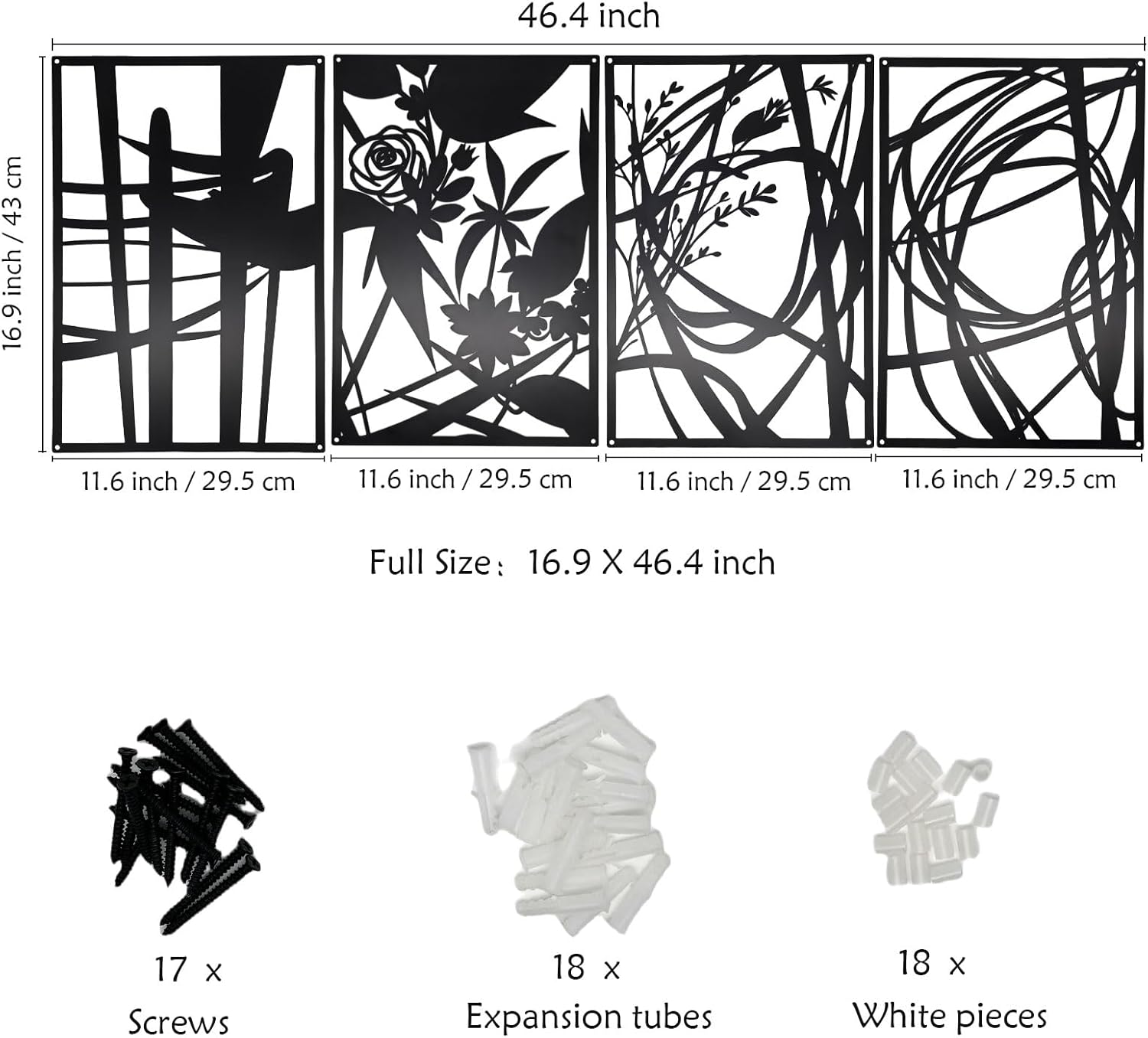 - MODERN METAL WALL ART DESIGN – Set of 4 black wall art with minimalist line art and abstract nature-inspired patterns, blending geometric metal wall decor with organic silhouettes of flowers, leaves, and birds