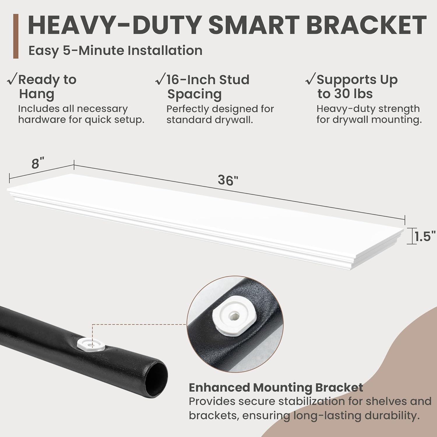 - Strong Suppoot: MDF wooden floating shelf with reinforced brackets supports heavy items effortlessly, holding up to 30 pounds. Hanging shelf's bracket has been preset with a 2° elevation to remain level and not sag after bearing heavy loads