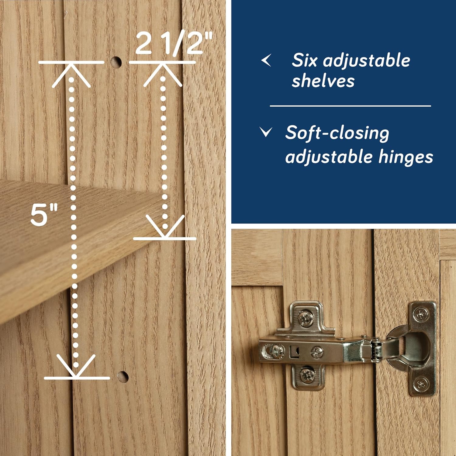 - ADJUSTABLE SHELVING Six adjustable shelves and full upper shelf for the ultimate storage versatility. Each adjustable shelf has a maximum weight capacity of 25 lbs