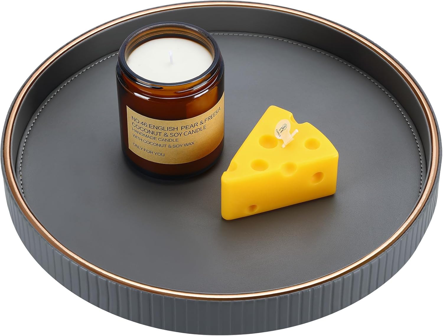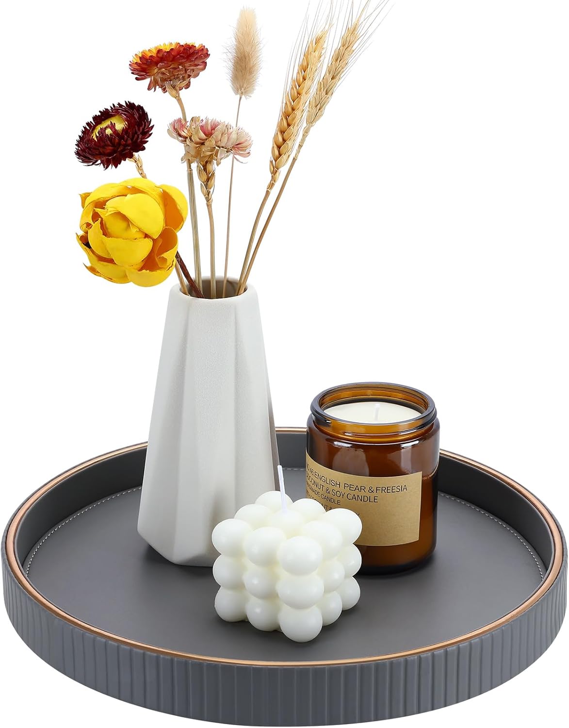 KINGFOM Decorative Serving Tray, PU Leather Valet Nightstand Desk Organizer for Men Women, Round Tray Decor for Coffee Table/Home Decor, Modern Decorative, Centerpiece (Gray)
