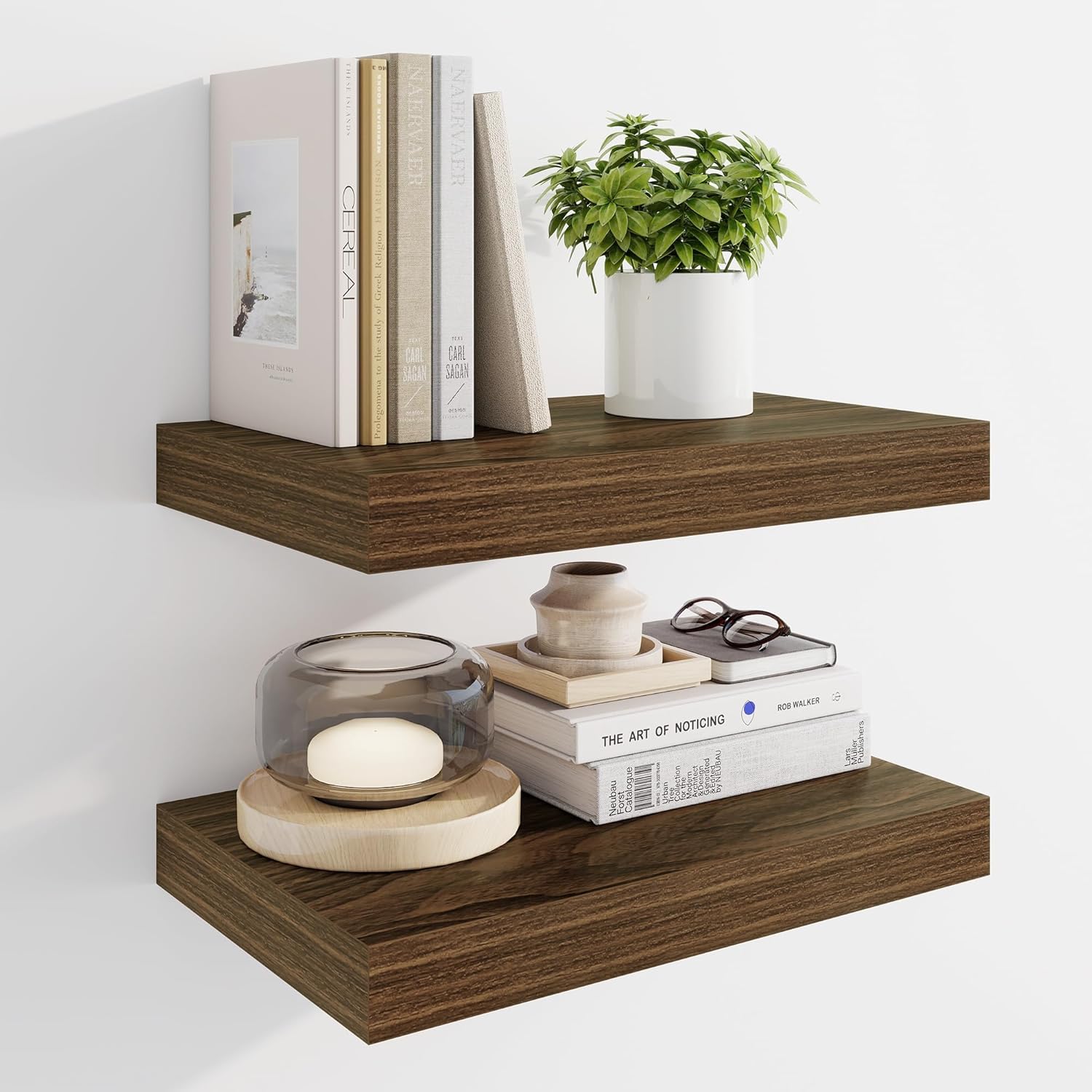 Marsmiles 16" Floating Shelves for Wall, Wooden Shelves with Invisible Brackets Set of 2, Rustic Farmhouse Wall Mounted Shelf for Kitchen Bathroom Living Room Study, Walnut