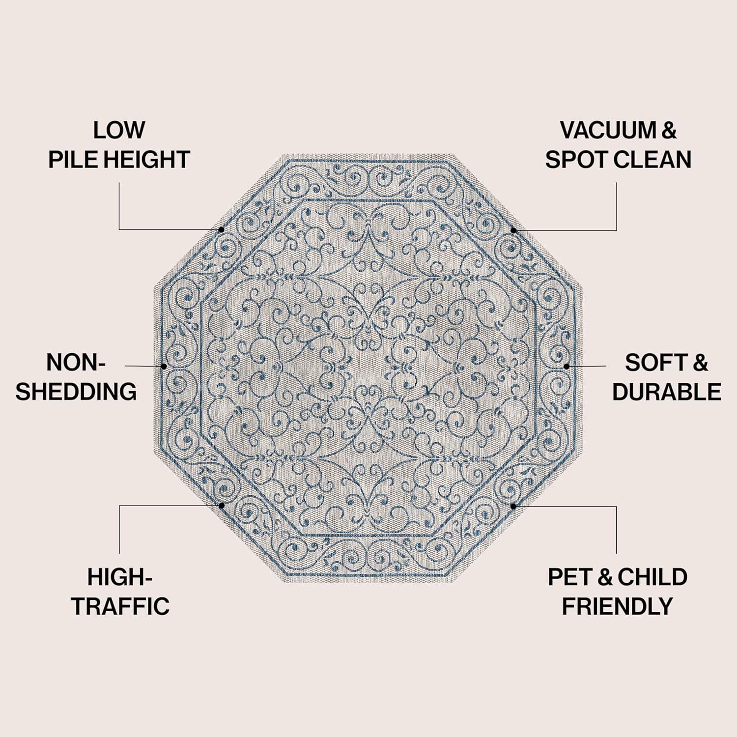 JONATHAN Y Vintage Filigree Indoor Outdoor Octagon Area Rug 5 Ft Gray/Navy, Charleston Textured Weave for Backyard, Patio, Porch, Easy-Cleaning, High Traffic, Pet-Friendly, Non-Shedding SMB106C-5TGN