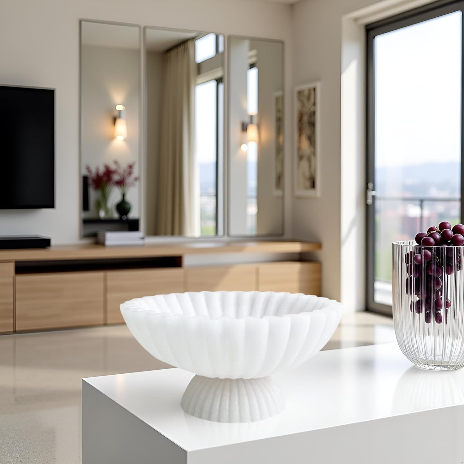 10" Large Decorative Bowl decor, Scalloped Bowls for Modern Home Decor,Ruffle Decor,Stylish Key Bowl for Entry Table,Decorative Fruit Bowl for Kitchen Counter,With base,Artificial Stone White