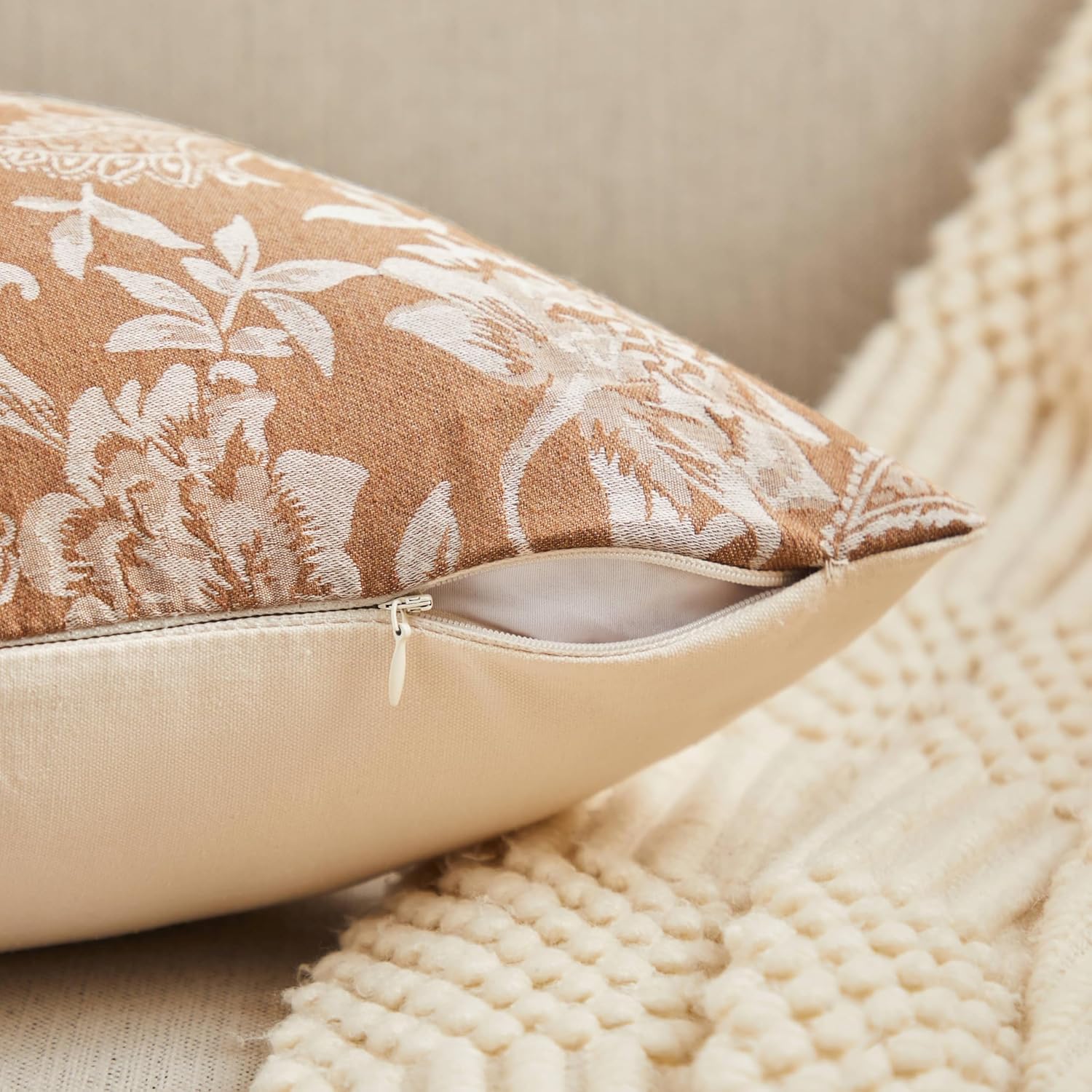 Floral Jacquard Lumbar Throw Pillow Covers Set of 2, Background/Caramal 12x20 Inch, Farmhouse Decorative Cotton Caramal Cushion Covers for Sofa Bed Living Room Home Decor