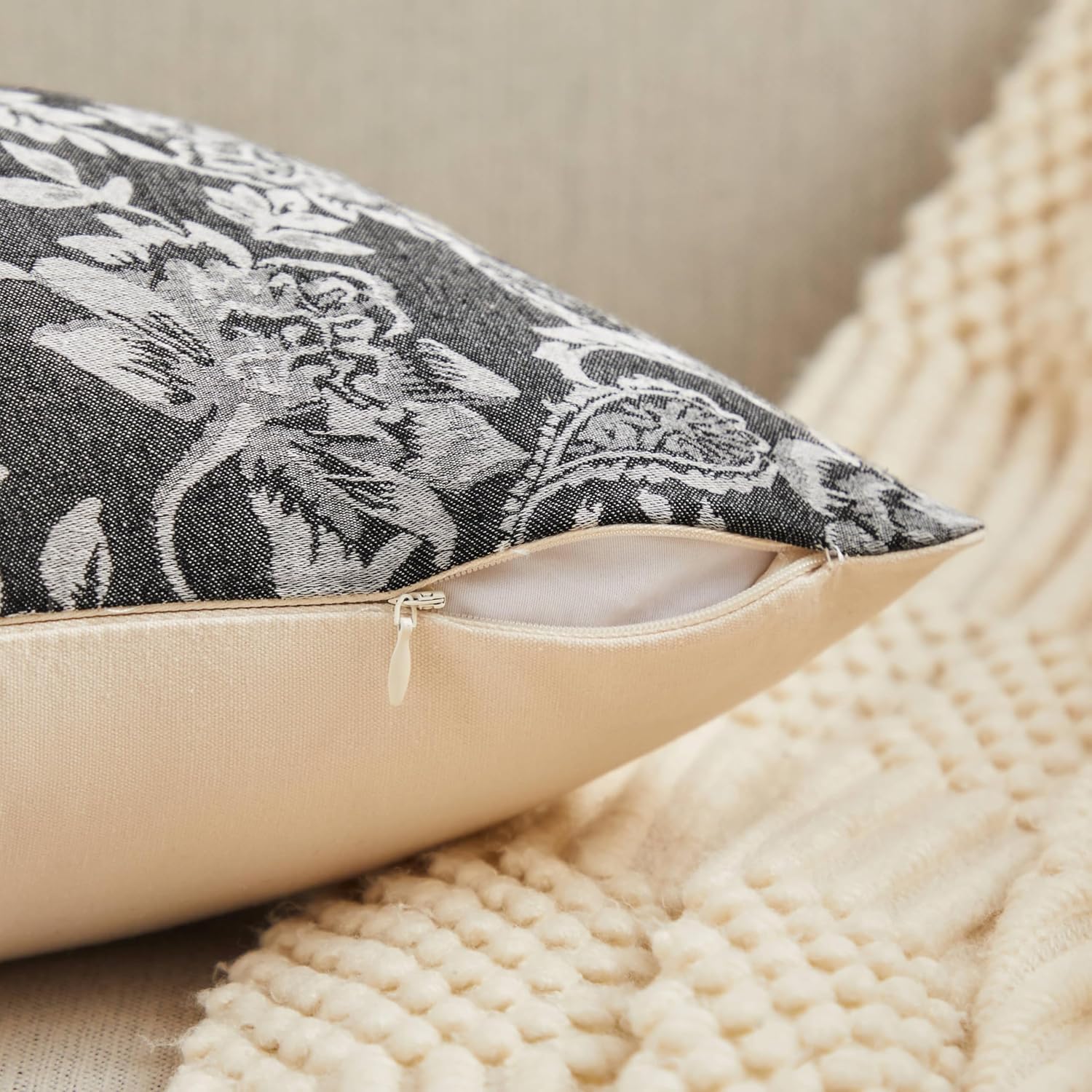 Floral Jacquard Throw Pillow Covers Set of 2, Background/Chocolate 16x16 Inch, Farmhouse Decorative Cotton Dark Brown Cushion Covers for Sofa Bed Living Room Home Decor