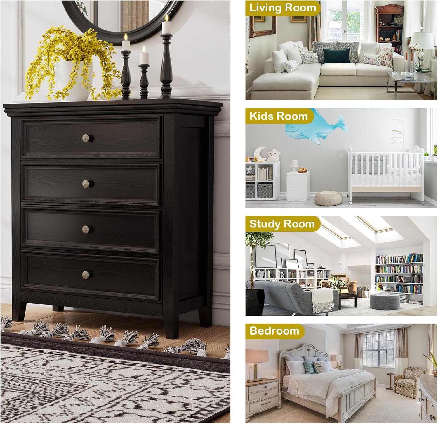 - ăMultipurpose Usageă The modern 4 drawer dresser can sit in any corner of you home to show your taste while bringing great function - in bedroom or closet to put clothes and overflow, in entryway to store keys and daily items.It is ideal for small spaces such as apartments and dorm rooms.