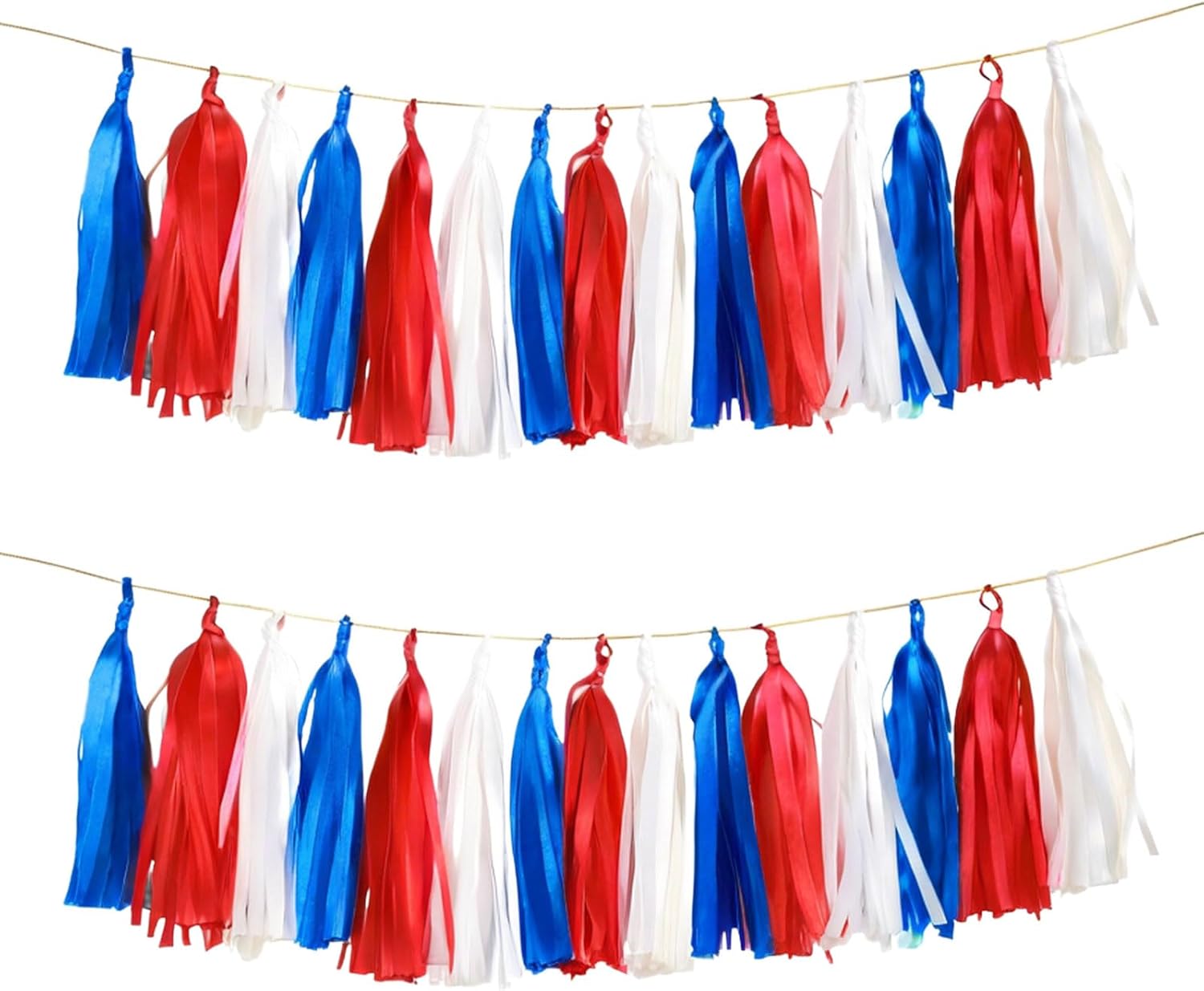 - PACKAGE CONTENTS: Set of 15 tissue paper tassels in red, navy, white,a 2 meterst twine for easy hanging and instant decoration