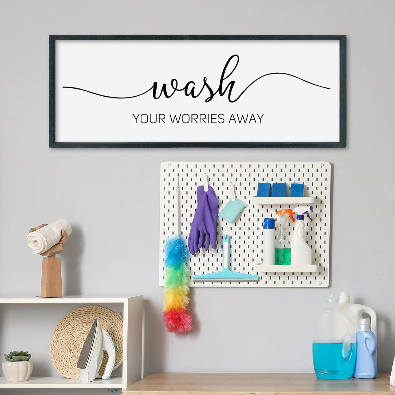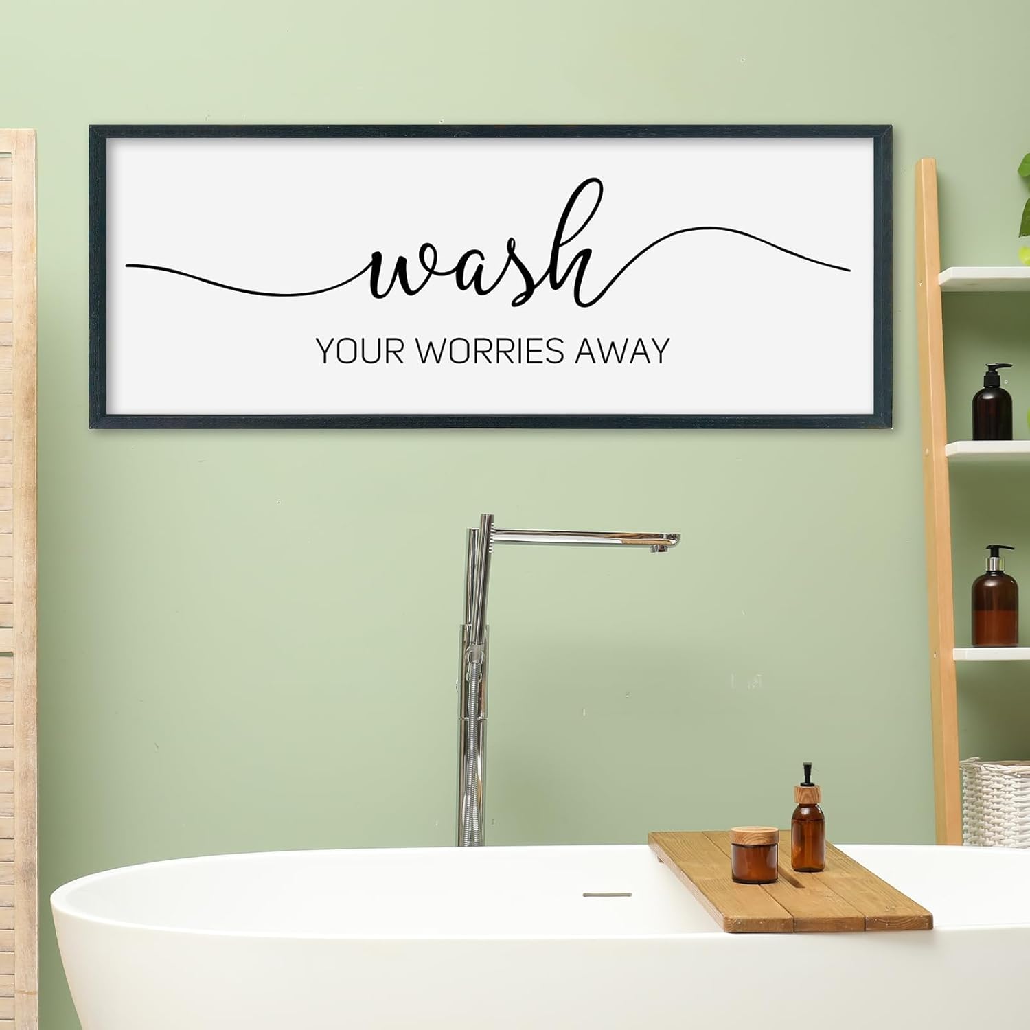 SRSZHIYUE Wash Your Worries Away Bathroom Sign Wall Art 32"×12" Funny Restroom Toilet Large Wood Framed Hanging Decor (Black)