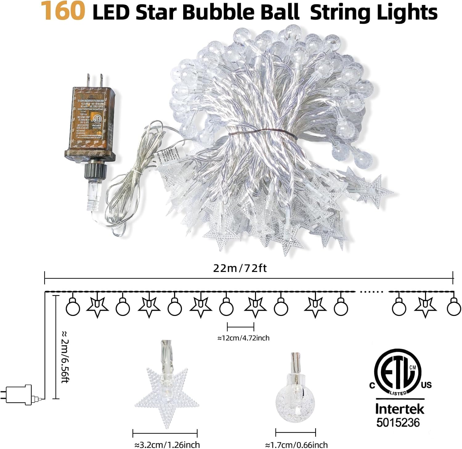 - Magical Ambiance with Spaced Crystal Globes & Stars:​​ Discover a sparkling fairy-tale atmosphere with 160 energy-efficient LED! Beautifully spaced crystal globes and delicate stars cascade across 72 FT (22 M) of gentle, warm white light.