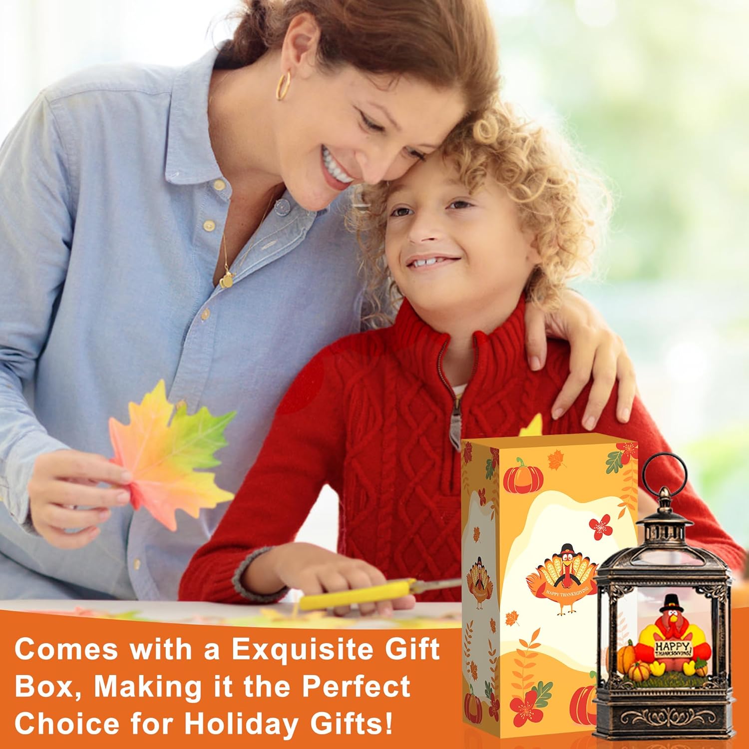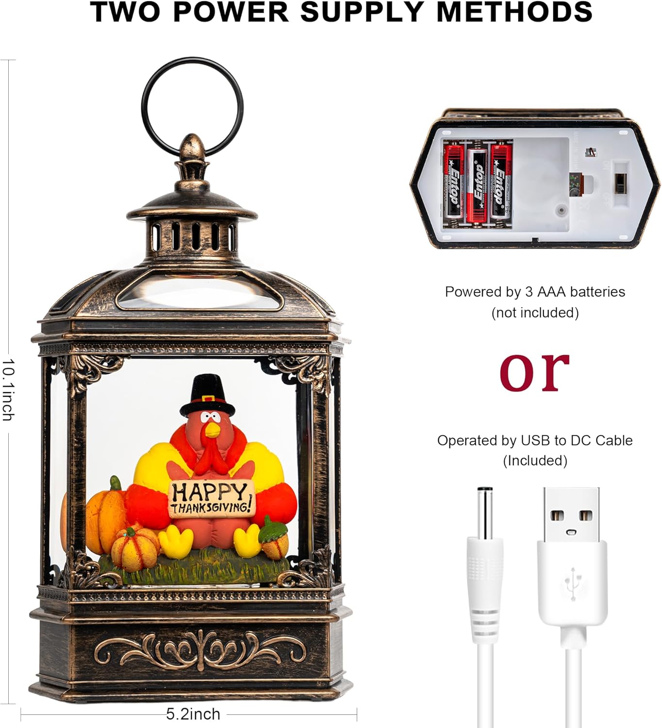 - đă Thanksgiving Featureă - When turned on, our bronze harvest lantern features a turkey wearing a pilgrim hat and holding a sign that reads âHappy Thanksgiving,â pumpkins, and fall scenes inside. The warm LED shines on the figurines while the swirling glitter gives our harvest lantern a beautiful fall feel.