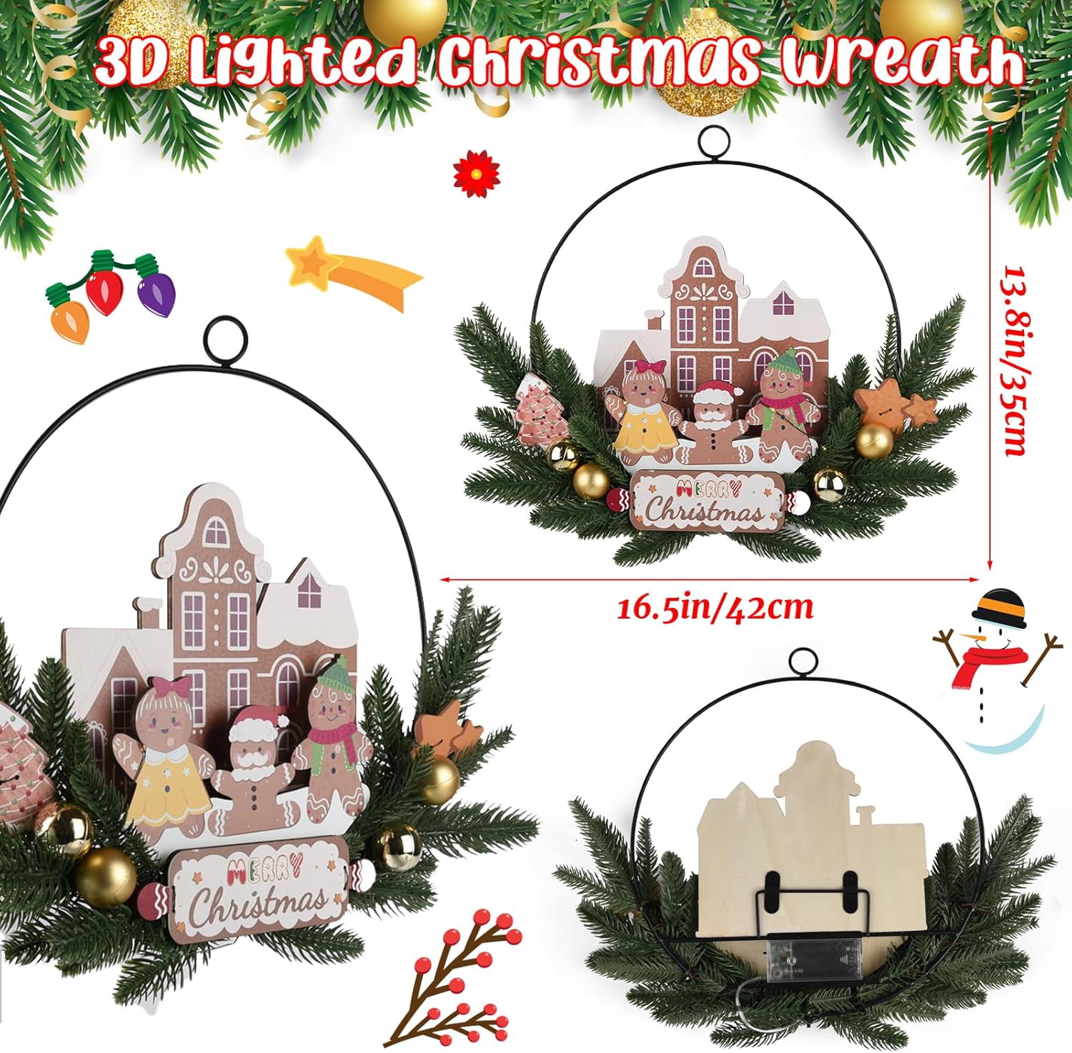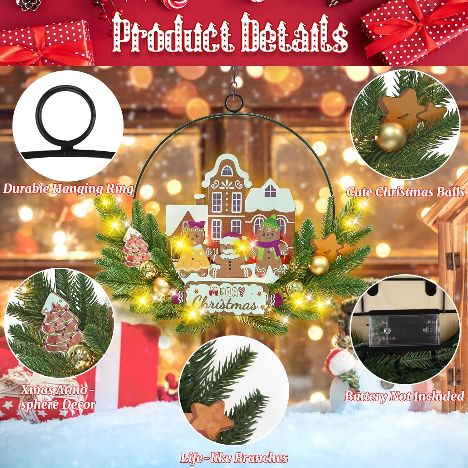 Light up Christmas Wreaths for Front Door, Welcome Metal Wooden Door Wreath Decor Hanging Sign, 30 LED Lighted Wall Decor Battery Operated for Halloween Indoor Outdoor (Gingerbread Man)