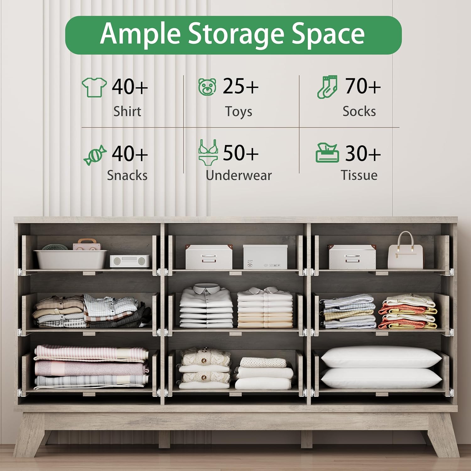 - ăLarge Storage CapacityăThe dresser for closet features 9 deep drawers that provide plenty of room for organizing clothing, bedding, cosmetics, or jewelry, helping you maintain a neat and tidy space. The wide wooden tabletop can serve as a dresser TV stand or display your decorations such as photo frames, plants or mirrors. Perfect for bedroom, living room, hallway, entryway