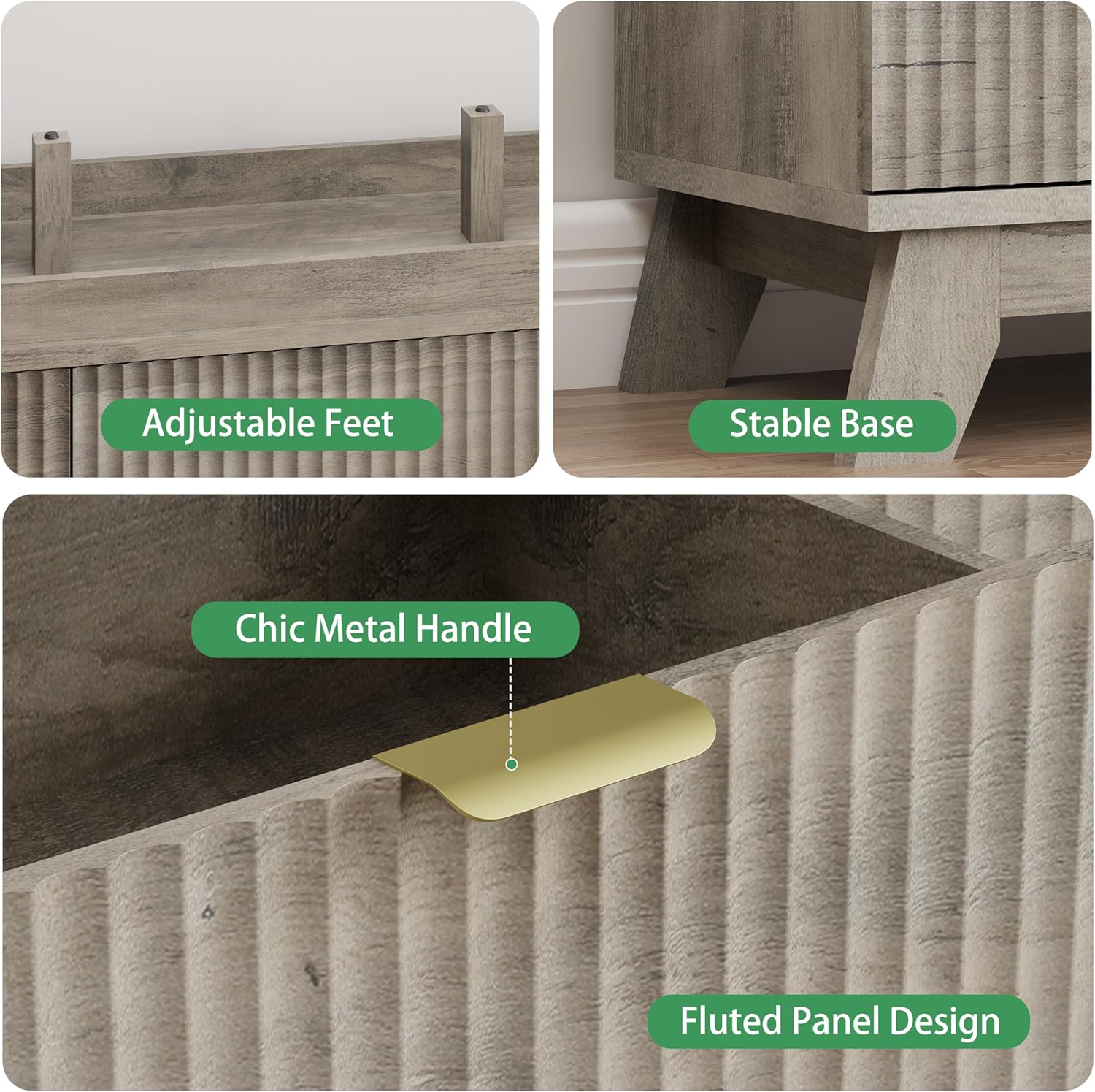 - ăModern Chic AppearanceăThe unique wave-like fluted panel enhances the texture and elegance of this bedroom dresser. The thick table top features natural wood grain that complements the natural oak finish. The wide metal handle and splayed base legs add a modern touch, creating a personalized and distinctive appearance