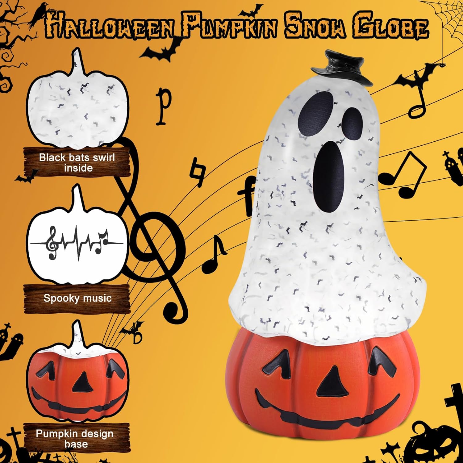 - Ultimate Halloween Atmosphere Creator: Transform any space into a haunted wonderland with pumpkin snow globe glitter. Packed with eerie Halloween charm, Halloween table decorations features swirling bats, ghostly music, and a pumpkin base. Perfect for fireplace mantels, tabletops, porches, or Halloween parties. Whether for haunted houses, or trick-or-treat displays, this Halloween decorations indoor mesmerizing piece keeps the Halloween spirit alive with its glowing light and haunting sounds.