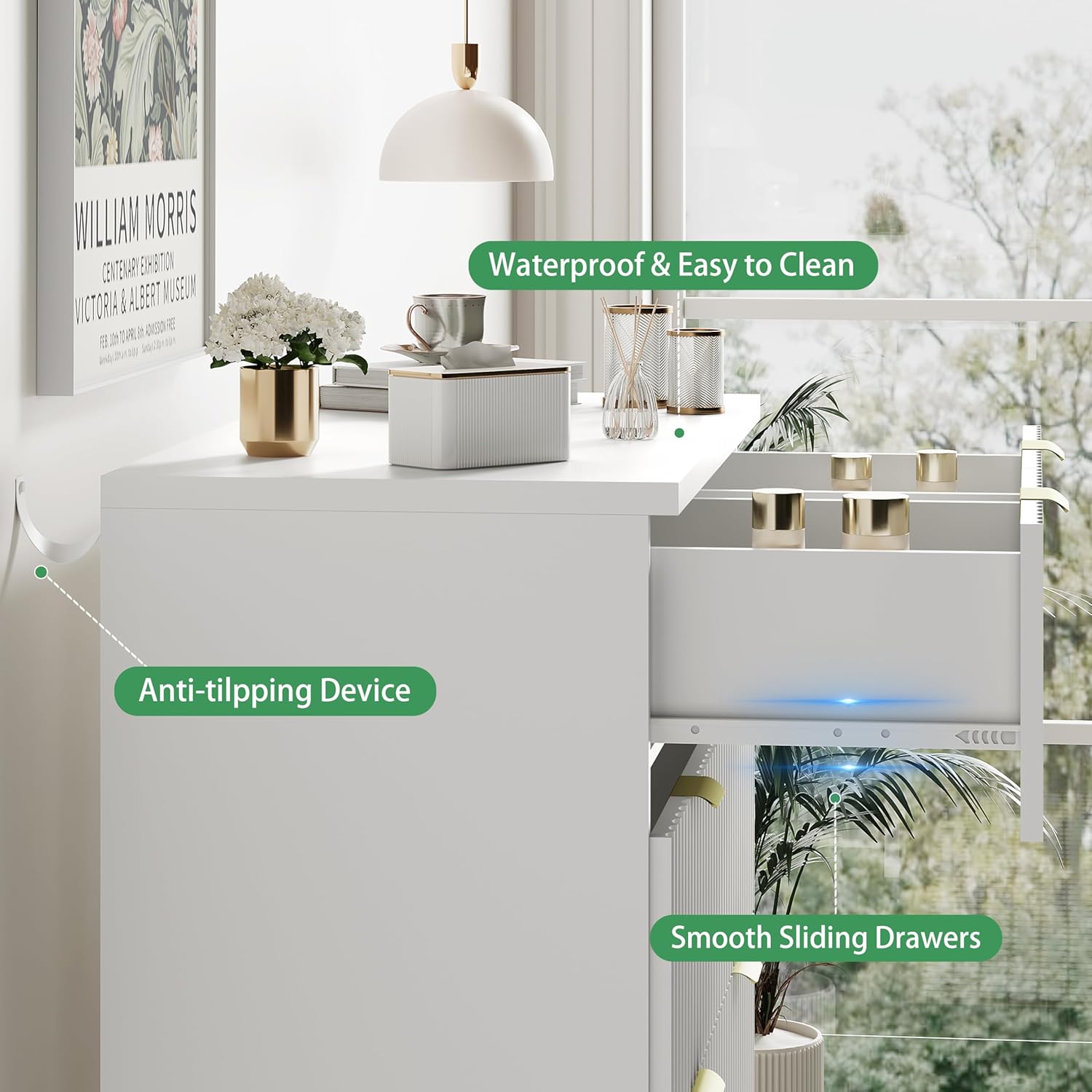 - ăModern Chic AppearanceăThe unique wave-like fluted panel enhances the texture and elegance of this bedroom dresser. The thick table top features natural wood grain that complements the white finish. The wide metal handle and splayed base legs add a modern touch, creating a personalized and distinctive appearance
