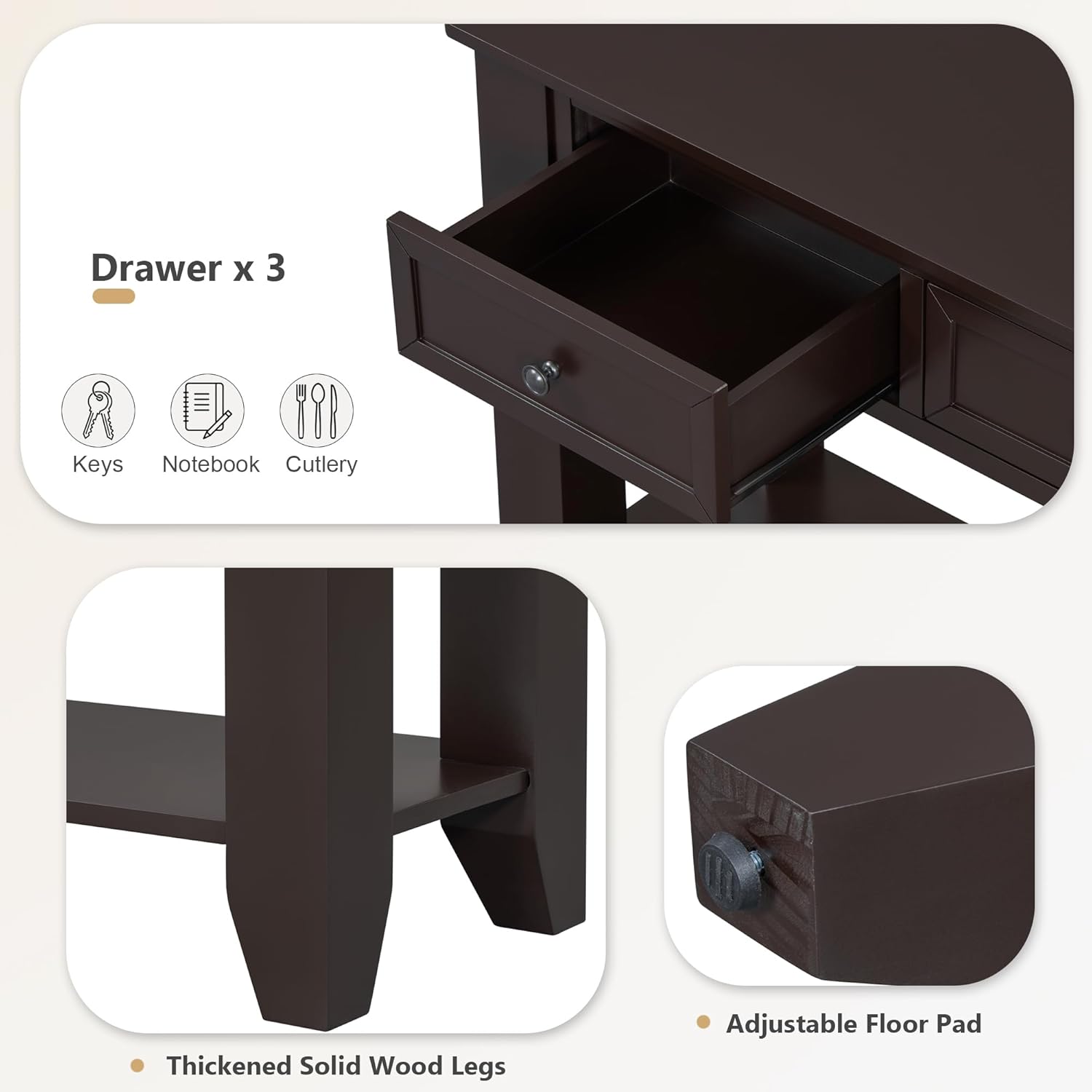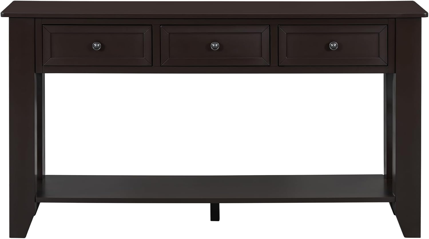 - Includes 3 drawers and 1 open shelf, this console table has sufficient space to tastefully showcase your favorite photos, lamps and alike, while tucking away keys, mails and other knick-knack.