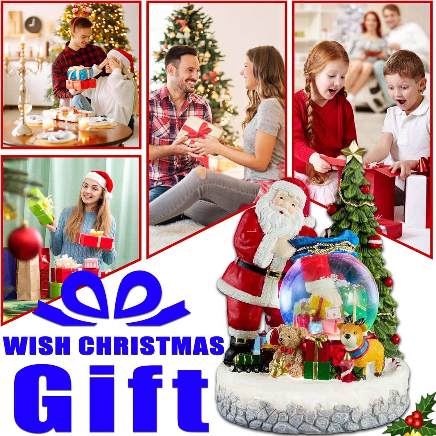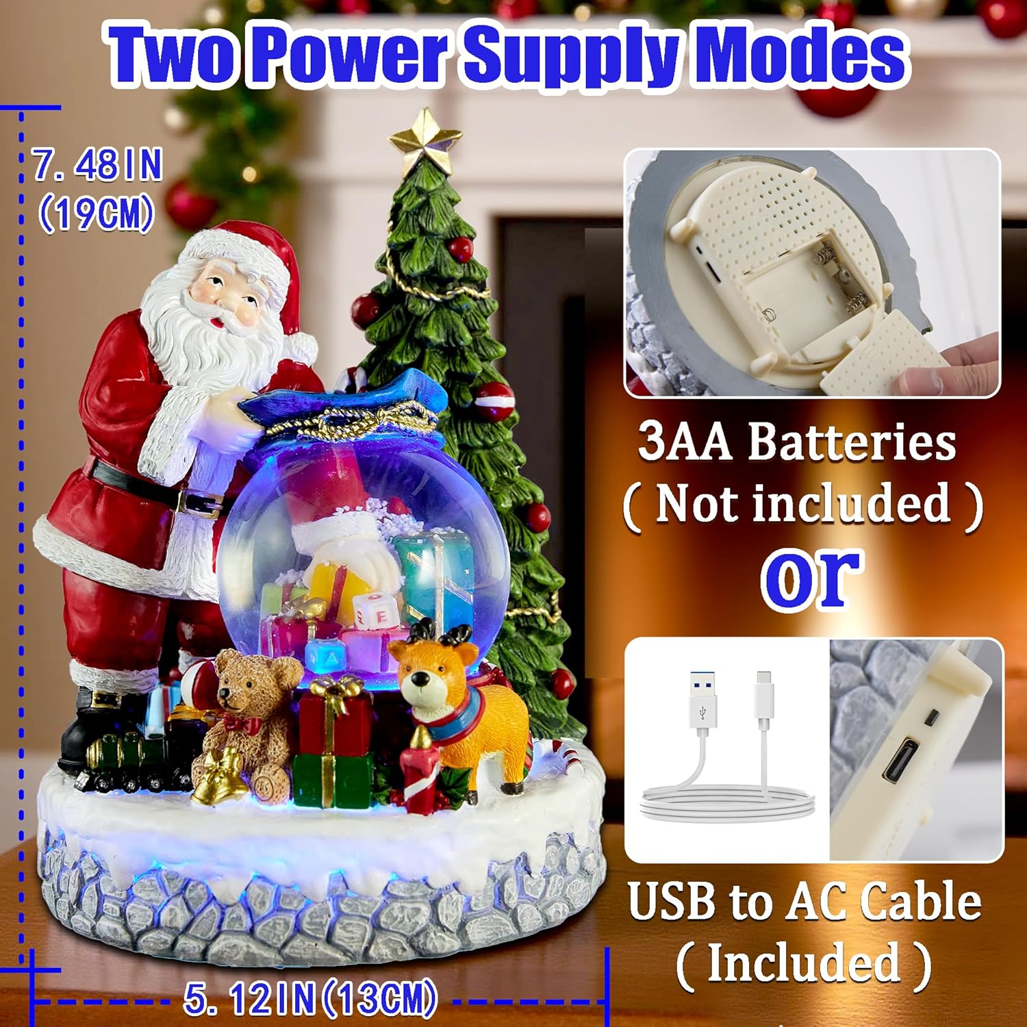 - đâď¸ă Exclusive Design ăThis Christmas tree is made of high-quality resin materials and exquisitely crafted. It features rich Christmas elements such as Santa Claus holding gifts, reindeer, Christmas trees, teddy bears, and bells. In the middle is a crystal-clear snowflake glass ball with a pile of glittering gifts inside. This is a unique product in the market. The snow globe has two modes: when the switch is turned on, mode one is "light on". After clicking the switch, Mode Two is "Light on + Music".