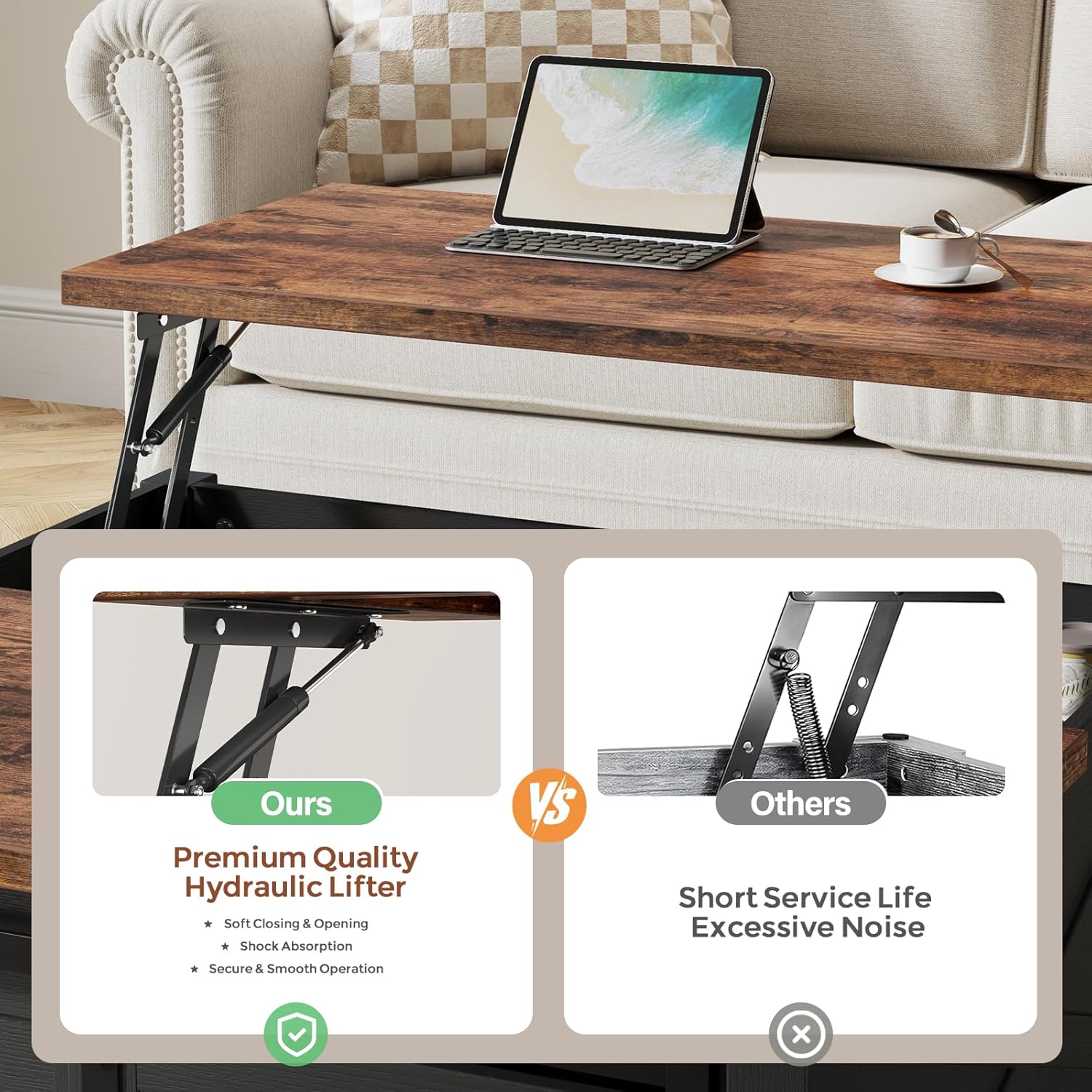 - ăPractical Lift-Top Designă:Equipped with high-quality lifting mechanisms and innovative stabilizing rod design, you can adjust the coffee tables top height from 18.1 to 23.6 inches to easily accommodate a variety of scenarios, such as working, dining, or gaming. Besides, the lift top coffee table is fitted with 4 silent pads, ensuring a gentle and noise-free descent of the tabletop.Max Lifted:25Lb.