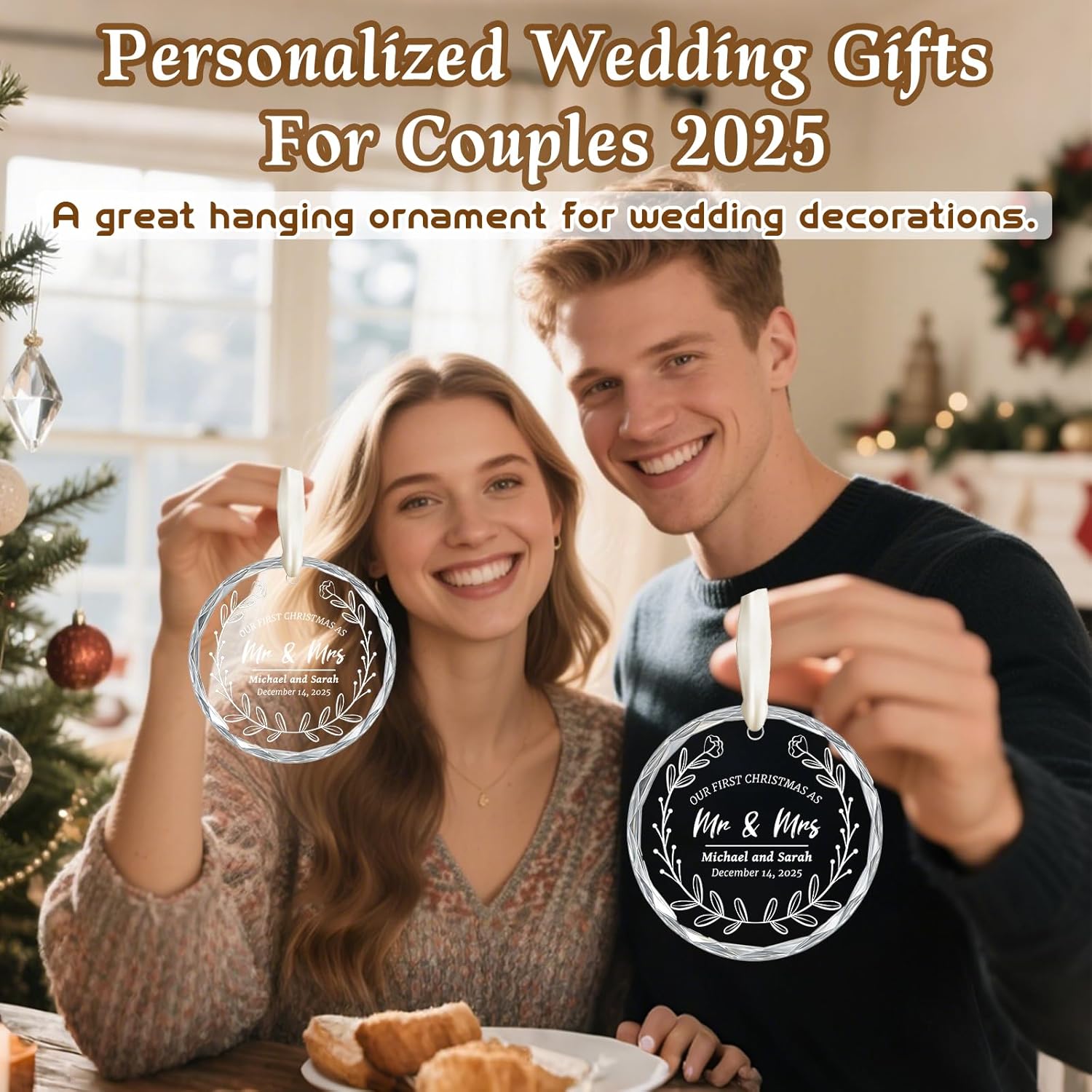 First Christmas Married Ornament 2025, Custom Wedding Crystal Glass Ornament with Photo, Name or Date, Personalized Wedding or Bridal Shower Gifts for Newlyweds