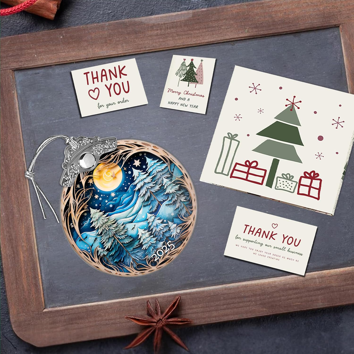 - 🎄 Winter Night Scene Ornament 2025 – Beautiful acrylic ornament featuring snowy pine trees, glowing full moon, and starry sky, perfect for holiday tree décor.