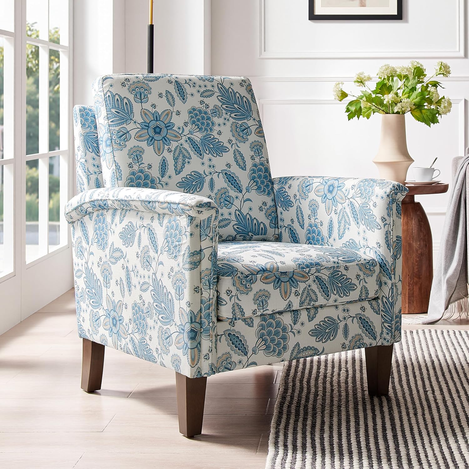 Floral Accent Chair, High Back Upholstered Armchair with Solid Wooden Legs, Padded Armrest and Removable Comfortable Cushioned Seat Single Sofa for Living Room, Bedroom, Blue