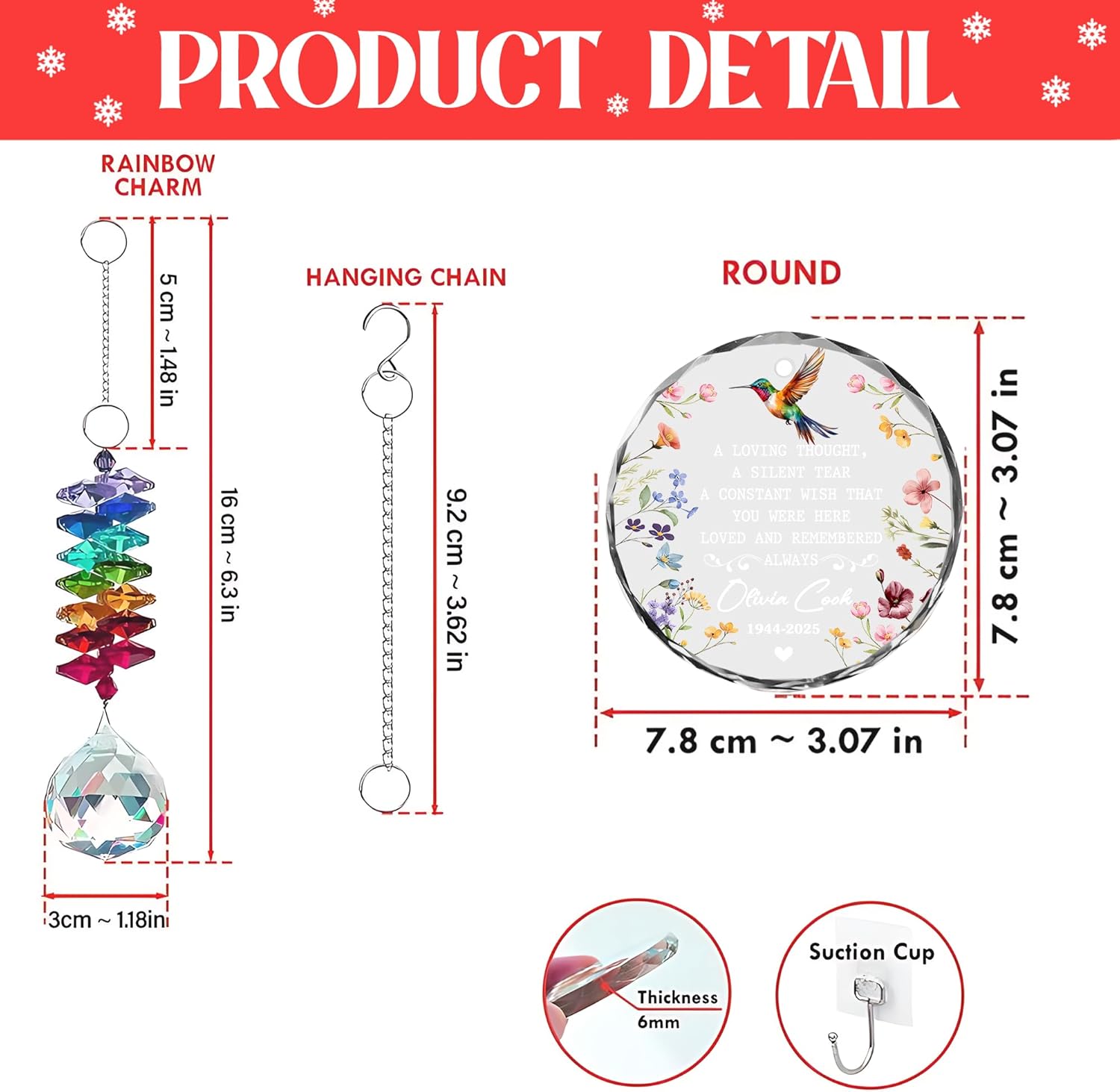 - Made from high-quality glass, this ornament features precise engraving and a smooth, polished finish. The attached rainbow suncatcher catches the light beautifully, adding a touch of sparkle and brightness to your holiday décor or any memorial display.